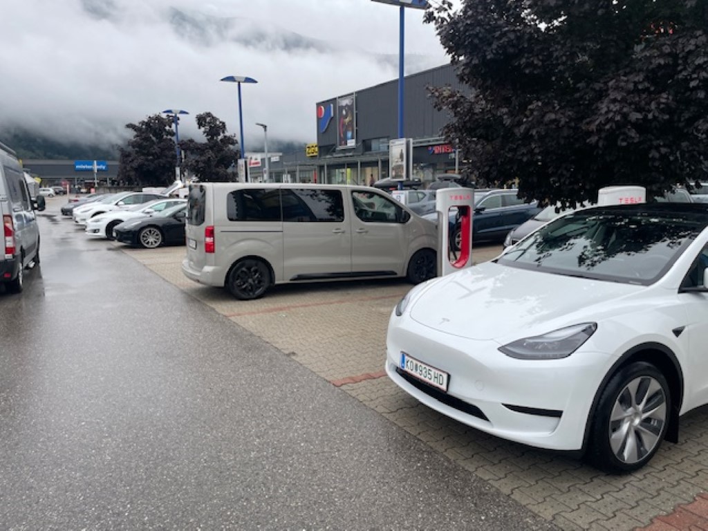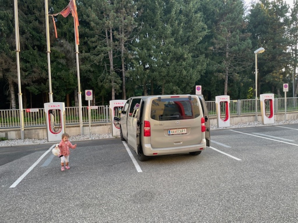 Kurz zu den Tesla Chargern: in Österreich, Deutschland und sonst noch ein paar ausgewählten Ländern hat Tesla das Laden auch für nicht Tesla-Fahrer freigeschalten, was die Auswahl an Ladestationen verbessert. Mit unserem Zafira waren wir auf unserem Trip bei beiden Ladestopps die einzigen Nicht-Teslas. (; Für die Ladung einfach Tesla App runterladen, Konto erstellen, Kreditkarte hinterlegen und Ladestation einfach per App freischalten. Die sehr kurzen Ladekabel sind ein kleiner Minuspunkt bei Tesla, wie am Foto zu sehen:
